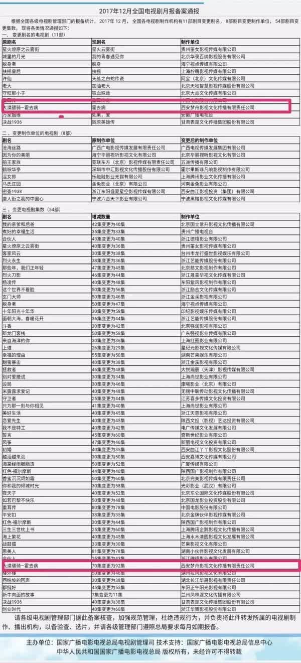 好奇的鲜妹去广电总局的网站搜了下备案,结果发现这部原来叫做《大漠骠骑——霍去病》的剧最早“只有”70集(这个长度已经很“赶客”了),到2017年底公示时却变成了92集。