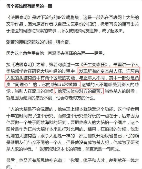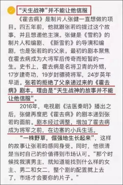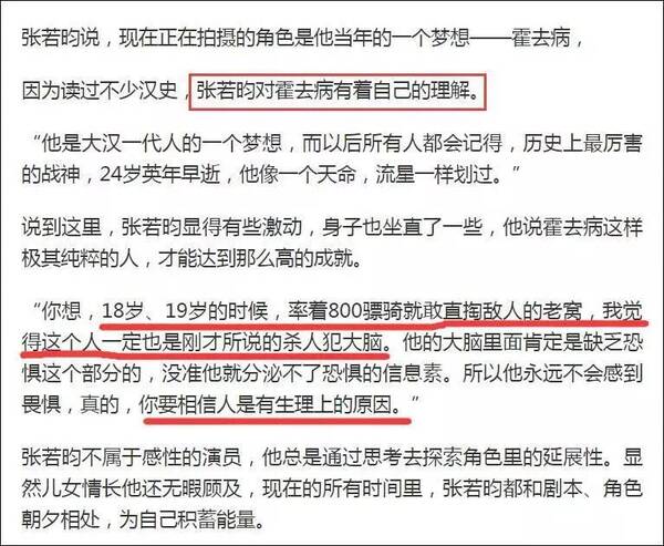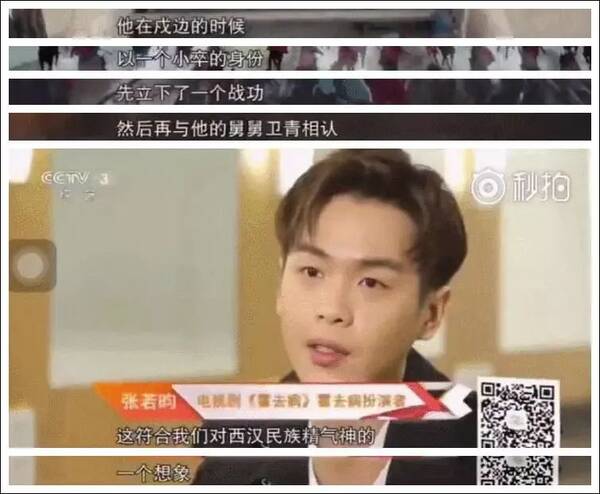 更令人难以接受的是张若昀对霍去病这个人物的看法。2016年,演完《法医秦明》的张若昀接受了《时尚芭莎》的采访,谈到了对“杀人狂”的认识,然后话锋一转,给霍去病扣上了一个“杀人犯”大脑。
