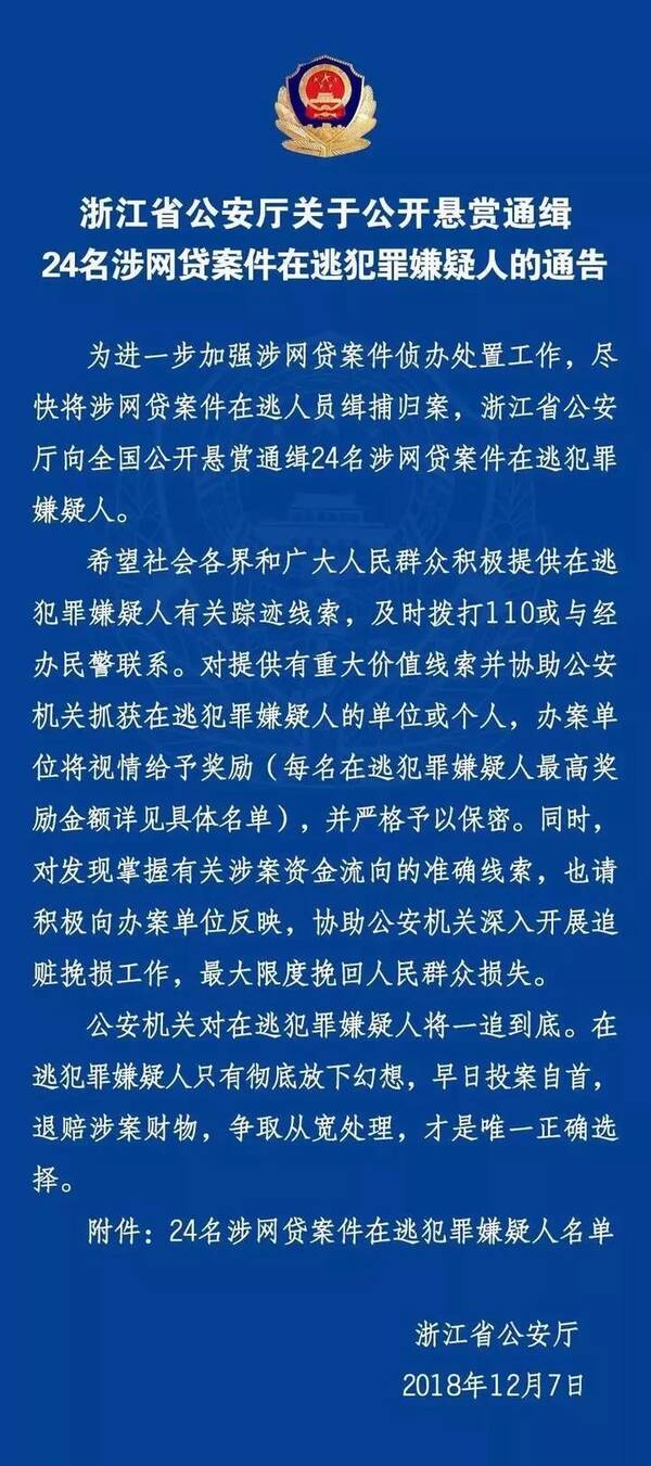 鲜妹试着用“PP基金陈刚”为关键词搜了一下,结果搜出了更“炸”的消息:12月7号浙江省公安厅公布的对24名涉网贷案件在逃人员悬赏通缉的通告中,出现了同名同姓的陈刚,身份证号也与上面“PP基金”受害者爆出来的一致。