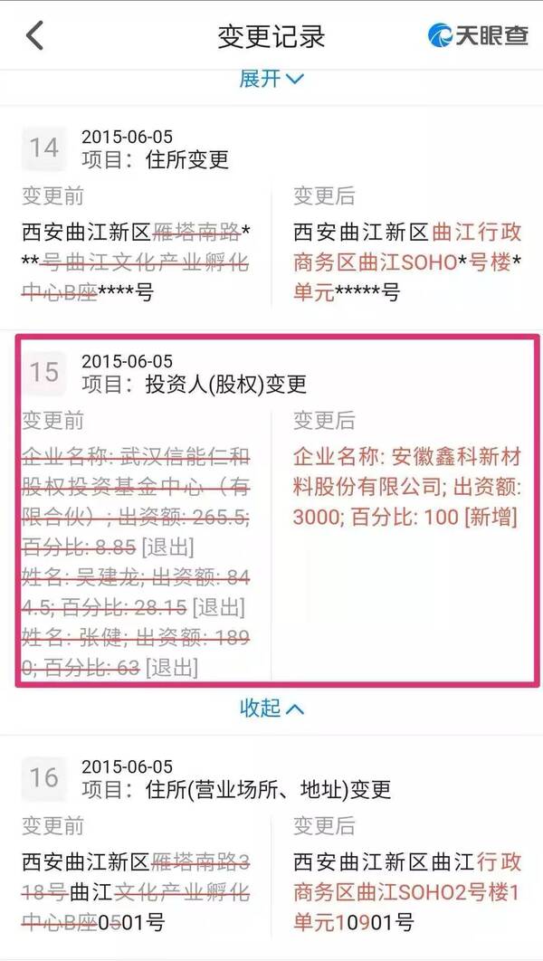 根据天眼查上公布的信息,西安梦舟之前的法人正是张健,2015年6月,公司法人变更为陈锡龙,行业代码也从“其他文化艺术业”变更为“电影和影视节目制作”。同时,张健也出让了全部股权,接盘的是安徽鑫科新材料股份有限公司(以下简称鑫科材料)。