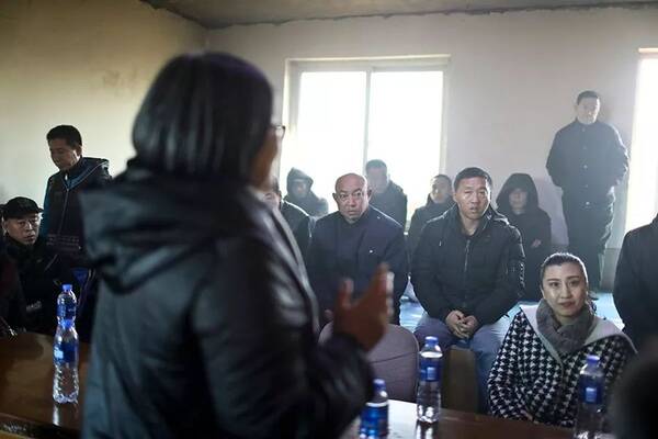 付广荣在给重刑刑释人员做“思想教育”宣讲。“付妈妈”的殡葬项目在重刑刑释人员中传开,全国各地都有人前来投奔,也有一些志愿者(右下一)参与到项目中。