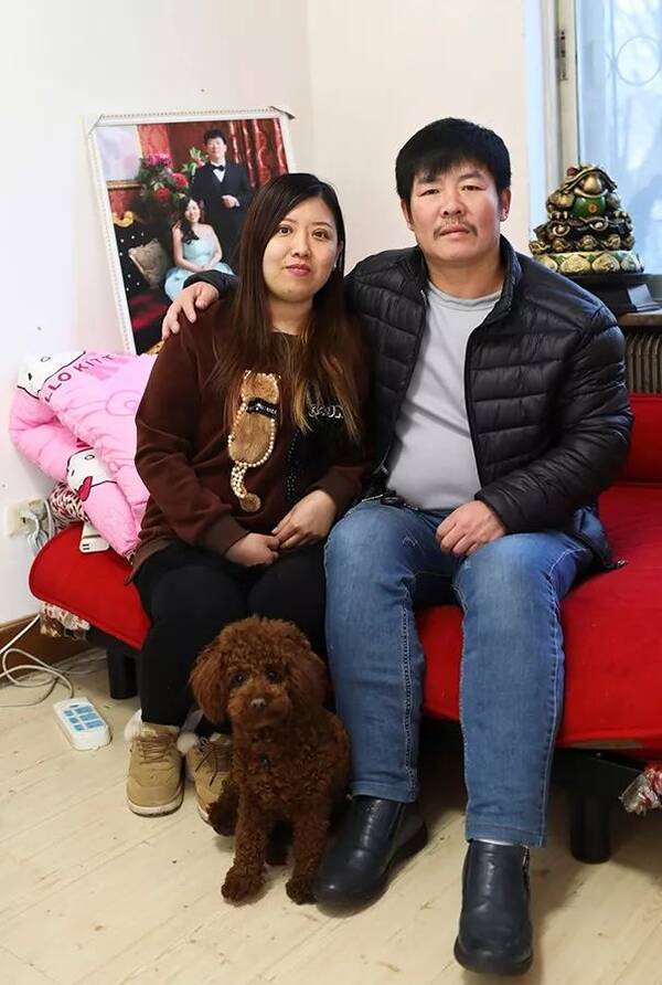 靠墙那头,是一幅结婚时拍的婚纱照:辣椒还是不爱笑,一只手搭在妻子肩头。小狮子穿着湖蓝色的抹胸礼服裙,笑着露出了牙。他们还一起养了一只叫“小年儿”的泰迪狗。