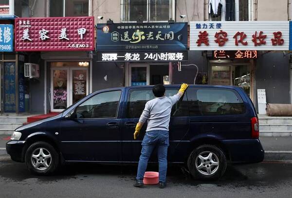 12月1日,辣椒在店门口擦洗自己的车,第二天要当出殡的头车。