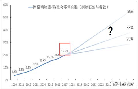 数据显示,剔除石油与餐饮,中国网购规模占社会零售总额的比例已经从2010年的3.5%提升到2017年的19.9%。而社区O2O兴起的2014-2015年,网购规模占社会零售总额的比例还在16%。