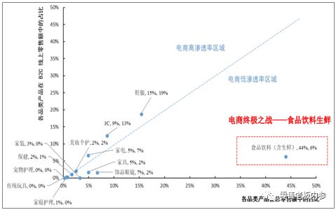 此外,在电商渗透率的提升过程中,品类分化现象十分严重。其中,食品饮料(含生鲜)占据了线上线下整体零售份额的44%,但在线上零售中仅占比6%。