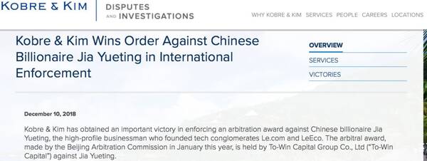 Kobre&Kim表示,这是债主第一次成功冻结了贾跃亭的海外资产。