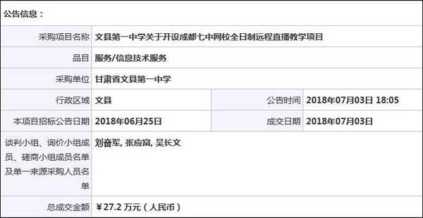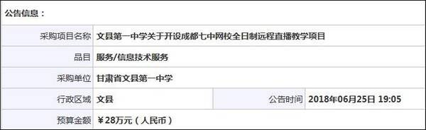中国政府采购网显示,甘肃文县第一中学今年6月曾就采购“成都七中网校全日制远程直播教学”项目发布公告,其中提及,文理科各设一班,首届直播资源服务费为“三年28万元”,且包括卫星设备费在内。