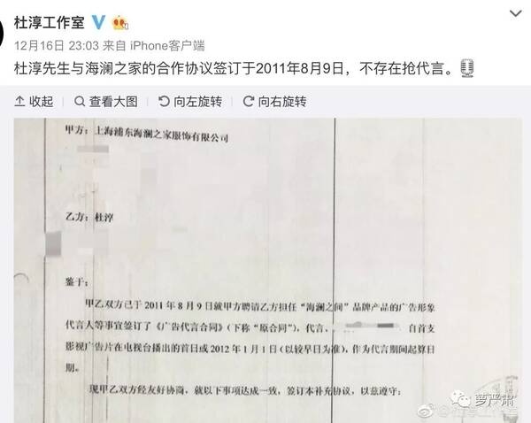 杜淳工作室昨晚11点多晒出了当年合同,力证代言合同早就签了